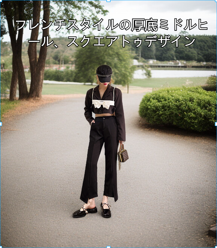 フレンチスタイルの厚底ミッドヒール、スクエアトゥデザイン、つま先閉じた快適な履き心地。夏のアウトドアに最適な2025年新作レディーススリッパ。