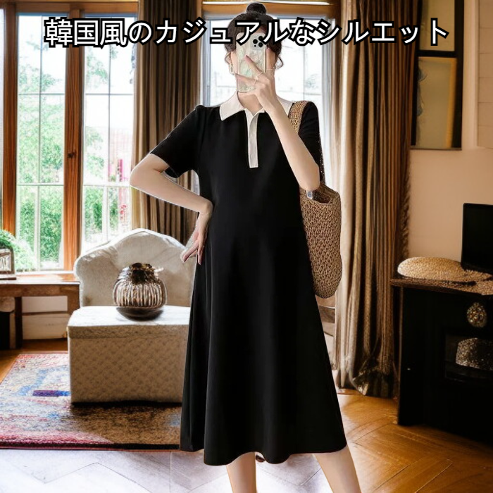 夏向け半袖マタニティドレス、ラペルデザイン、韓国風、ゆったりシルエット。快適な着心地とおしゃれなポロスカートで妊娠中も美しく。